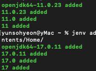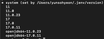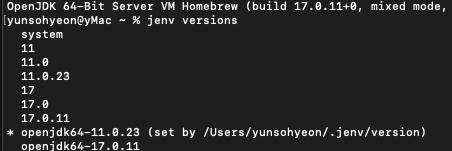 # 11๋ก ๋ฒ์ ๋ณ๊ฒฝ์ ์ํด, java ๋ฒ์ ์ค์น๋ ๊ฑฐ jenv versions ๋ก ํ์ธ, ๊ทธ๋ฆฌ๊ณ ์ ๋ ฅํ๋ฉด ๋จ