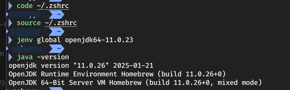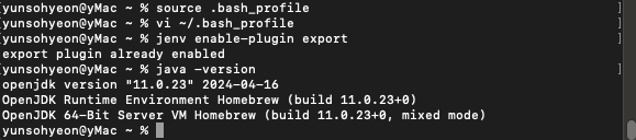 # ์ ์ญ์ผ๋ก ์ค์ , ํ์๋ openjdk64-11.0.23 ์ด๋๊น jenv global openjdk64-11.0.23 ์