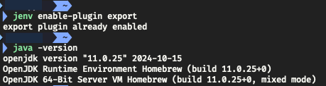 # jenv์ Export Plugin ํ์ฑํ --> zshrc์ ์๊น ์ถ๊ฐํ jenv init (jenv์ ์ด๊ธฐํ ์ฝ๋) ์ค์ ์ด ๊ผญ ๋์ด์์ด์ผ ํ๋ค.(์ด๊ฒ ํต์ฌ)