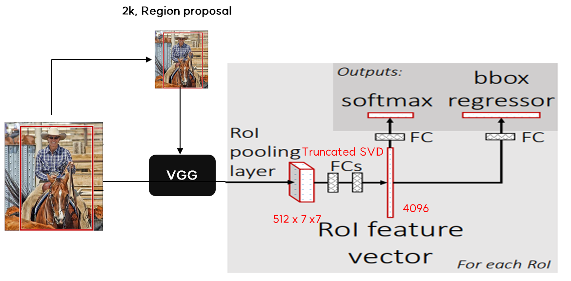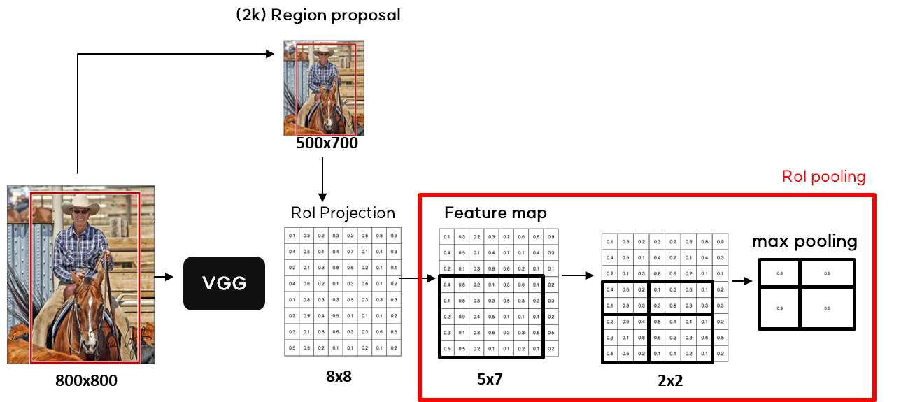 ์ฆ, 2000๋ฒ CNNํ์ง ์๊ณ 1๋ฒ์ CNN์ ํตํด ์๊ฐ์ ์ค์ฌ์ฃผ์์ผ๋ฉฐ, Selective Search์ ๊ฒฝ์ฐ RoI ์์ญ์ด ๊ฐ๊ฐ ๋ค๋ฅธ ํฌ๊ธฐ๋ฅผ ๊ฐ์ง๊ณ ์๋ค. ์ด ํฌ๊ธฐ๋ฅผ ๋ง์ถฐ์ฃผ๊ธฐ ์ํด RoI Pooling์ ์ํํ๋ค.