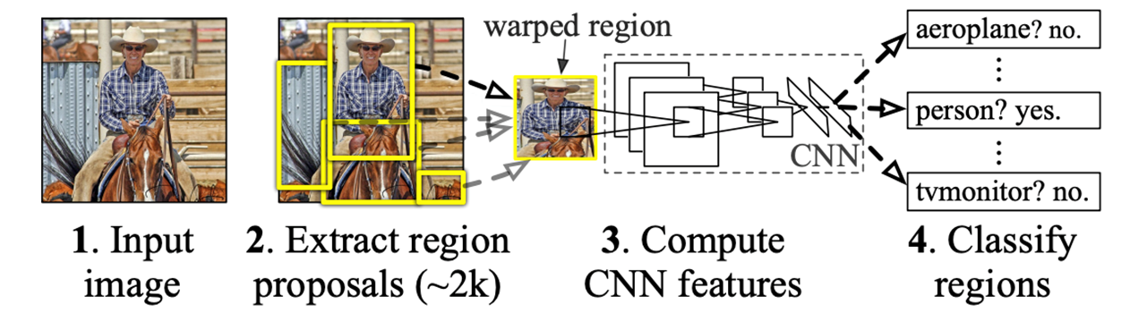 1) ๋จผ์ Input Image์์ selective search๋ฅผ ํตํด 2000๊ฐ์ RoI๋ฅผ ๊ตฌํ ํ,
