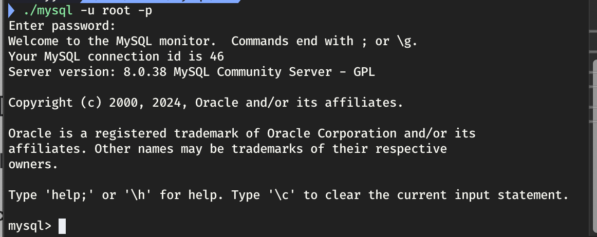- ./mysql -u root -p : MySQL ์ ์ํ๊ธฐ (**Enter password๋ MySQL ํ์ผ ๋ค์ด๋ฐ์ผ๋ฉด์ ์ค์ ํ ๋น๋ฐ๋ฒํธ)