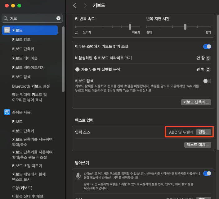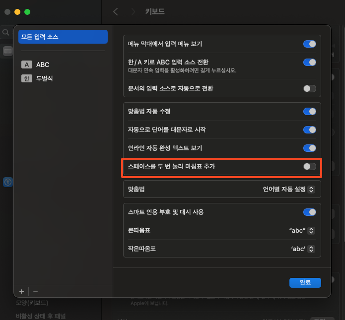 ์์คํ ์ค์ > ํค๋ณด๋> ํ ์คํธ ์ ๋ ฅ์ ํธ์ง> ๋ง์นจํ ์ถ๊ฐ๋ฅผ ํด์