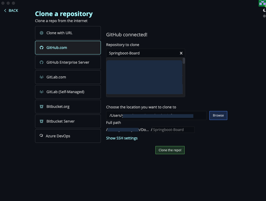 - 그 다음 깃허브 계정과 연결해준 다음에, Clone Repo > Github.com > 자신의 레파지스토리 클릭 합니다.