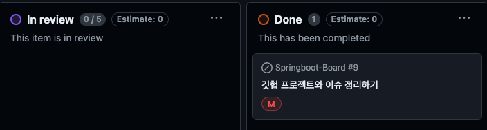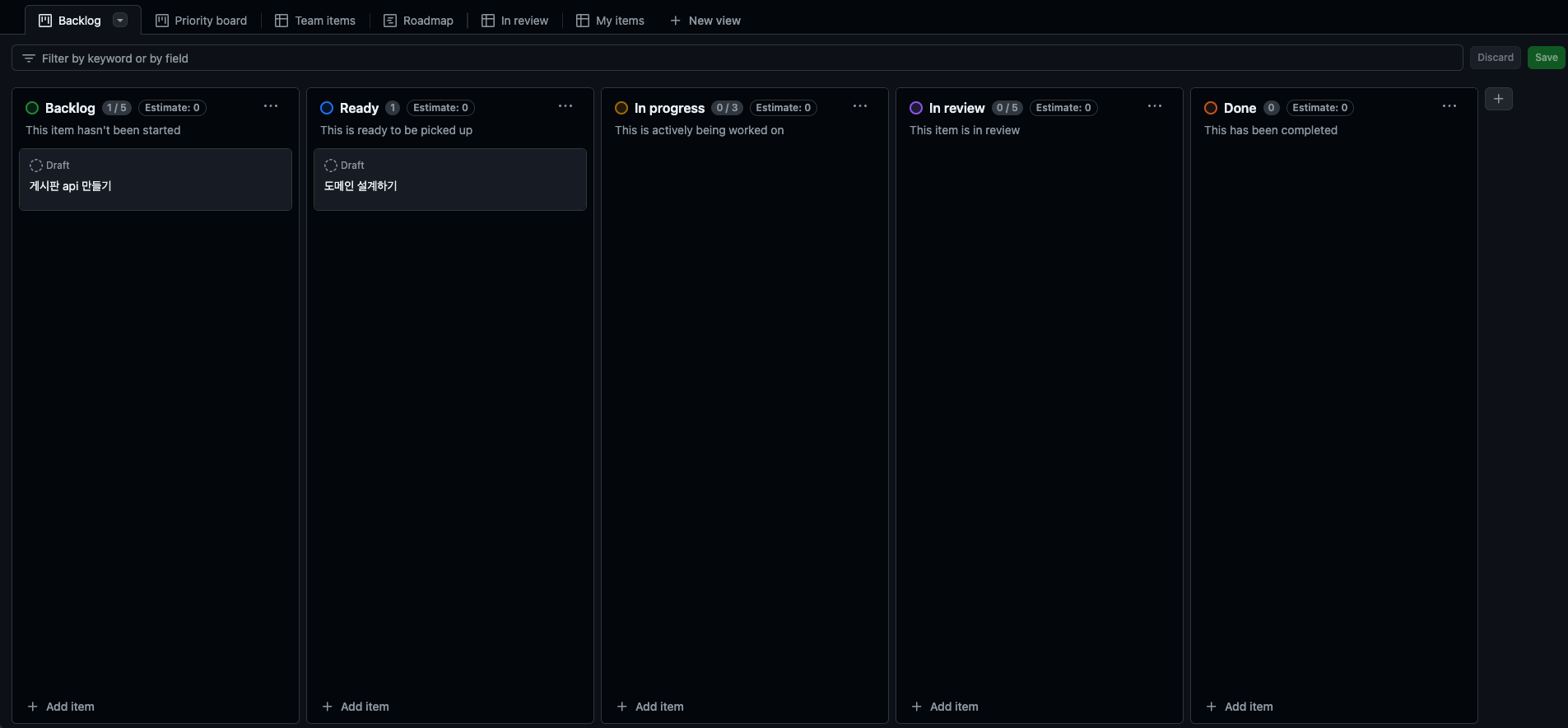 GitHub에서 칸반(Kanban) 보드를 사용할 때, 각 컬럼(Backlog, Ready, In Progress, In Review, Done)의 의미는 다음과 같습니다: