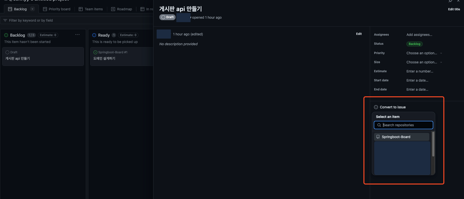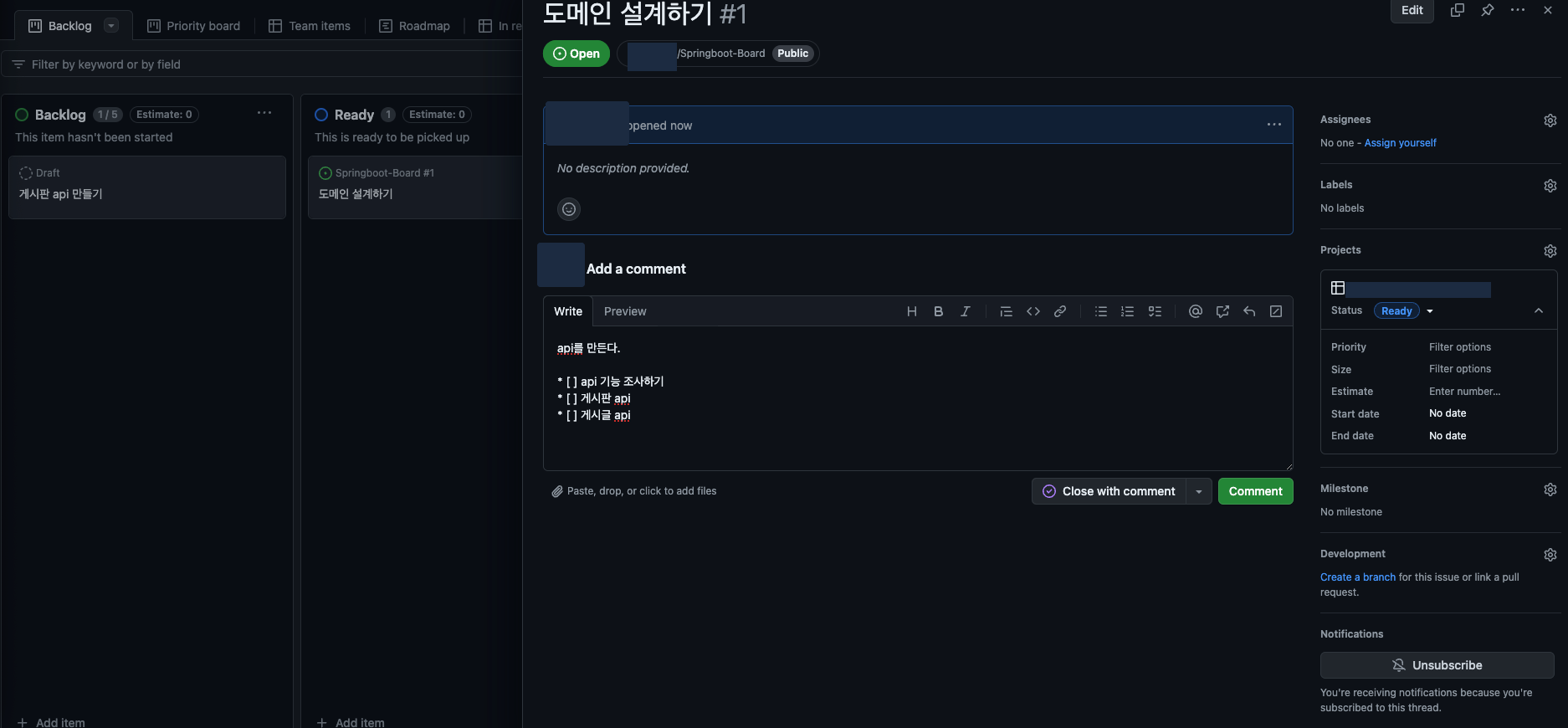 Assignees, Labels, Projects(Priority, Size, ..) 를 선택합니다.