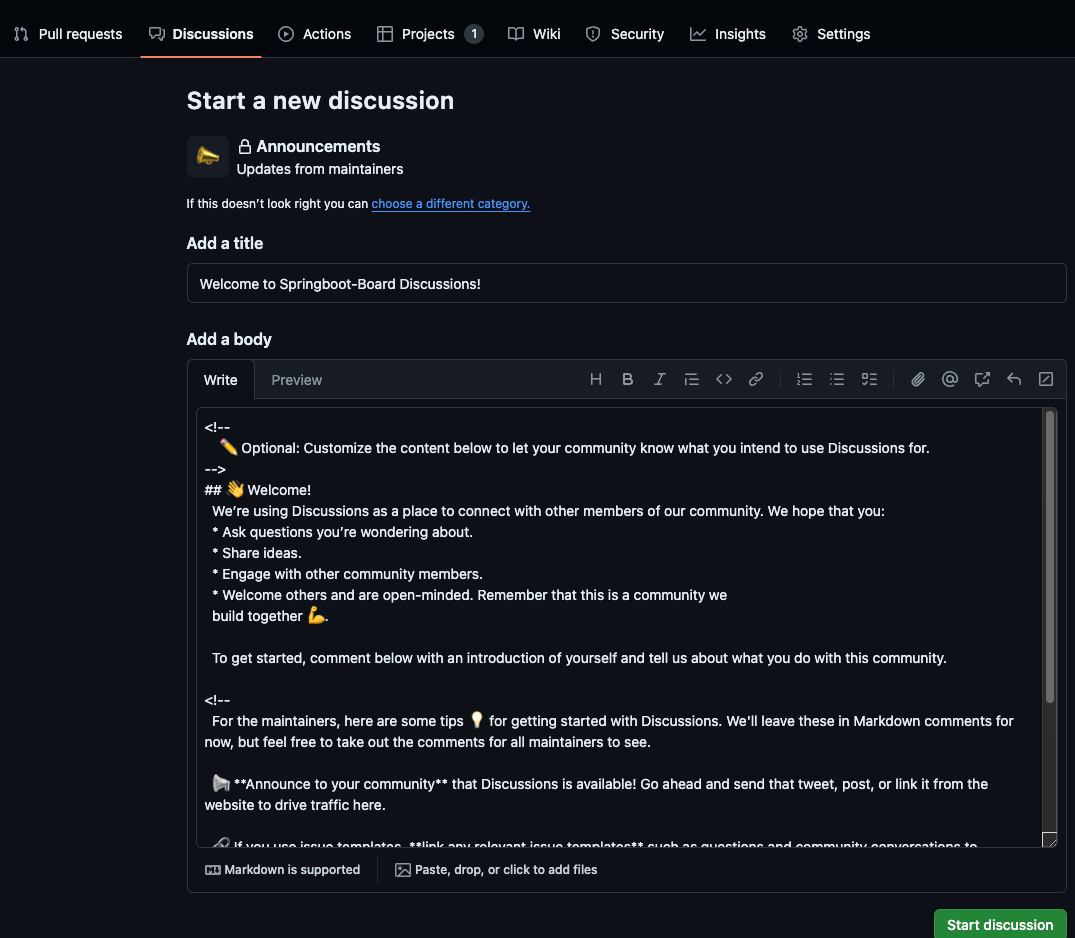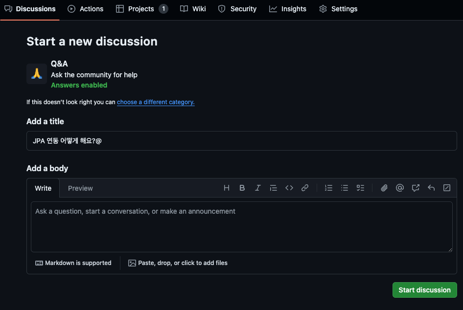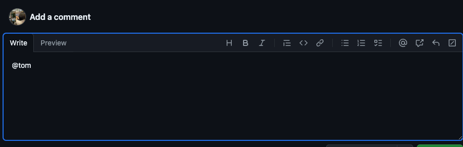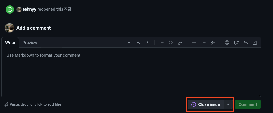 - 팀 프로젝트를 진행할 경우, 이슈 만든 다음에 In review 에서 ex) "@tom 코드 리뷰 부탁드립니다."(tom이 팀원 이름이라고 가정할 때) 입력하기