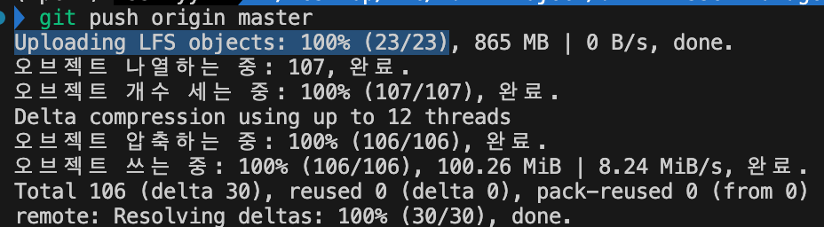 - 이후 확인해보니 Git LFS 설치 후, git add . 를 통해 푸시해도 올라가는 것을 확인했습니다.