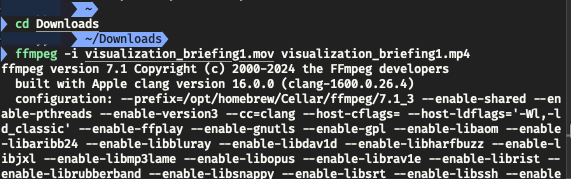 - ํฐ๋ฏธ๋์์ cd ๋ช ๋ น์ด๋ฅผ ์ด์ฉํด ๋ณํํ๊ณ ์ ํ๋ .mov ํ์ผ์ด ์๋ ๊ฒฝ๋ก๋ก ์ด๋ํฉ๋๋ค.