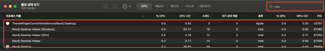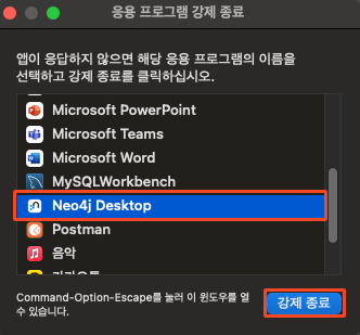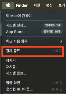 - ์์คํ ์๋ ๋จ์ง ์๋๋ค๋ฉด? (cmd+space bar) > ํ์ฑ ์ํ ๋ณด๊ธฐ > ์ฑ ๊ฒ์ > ๊ด๋ จ ๋ชจ๋ ๊ฐ์ ์ข ๋ฃ