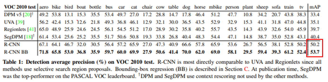 - R-CNN은 DMP: 기존의 objection model과, selective search를 사용한 UVA보다 R-CNN의 성능이 확연히 높으며,